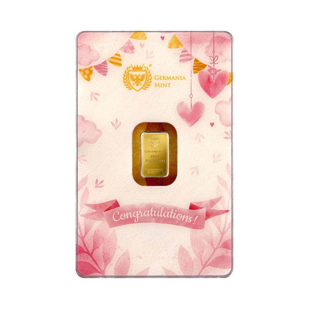 Ein 1-g-Goldbarren in einer speziellen Gedenkausgabe, der speziell für die Geburt eines Kindes geschaffen wurde. Erhältlich in zwei Versionen: für ein Mädchen und für einen Jungen. Ein Geschenk, das sowohl als Andenken als auch als Investition dient.
