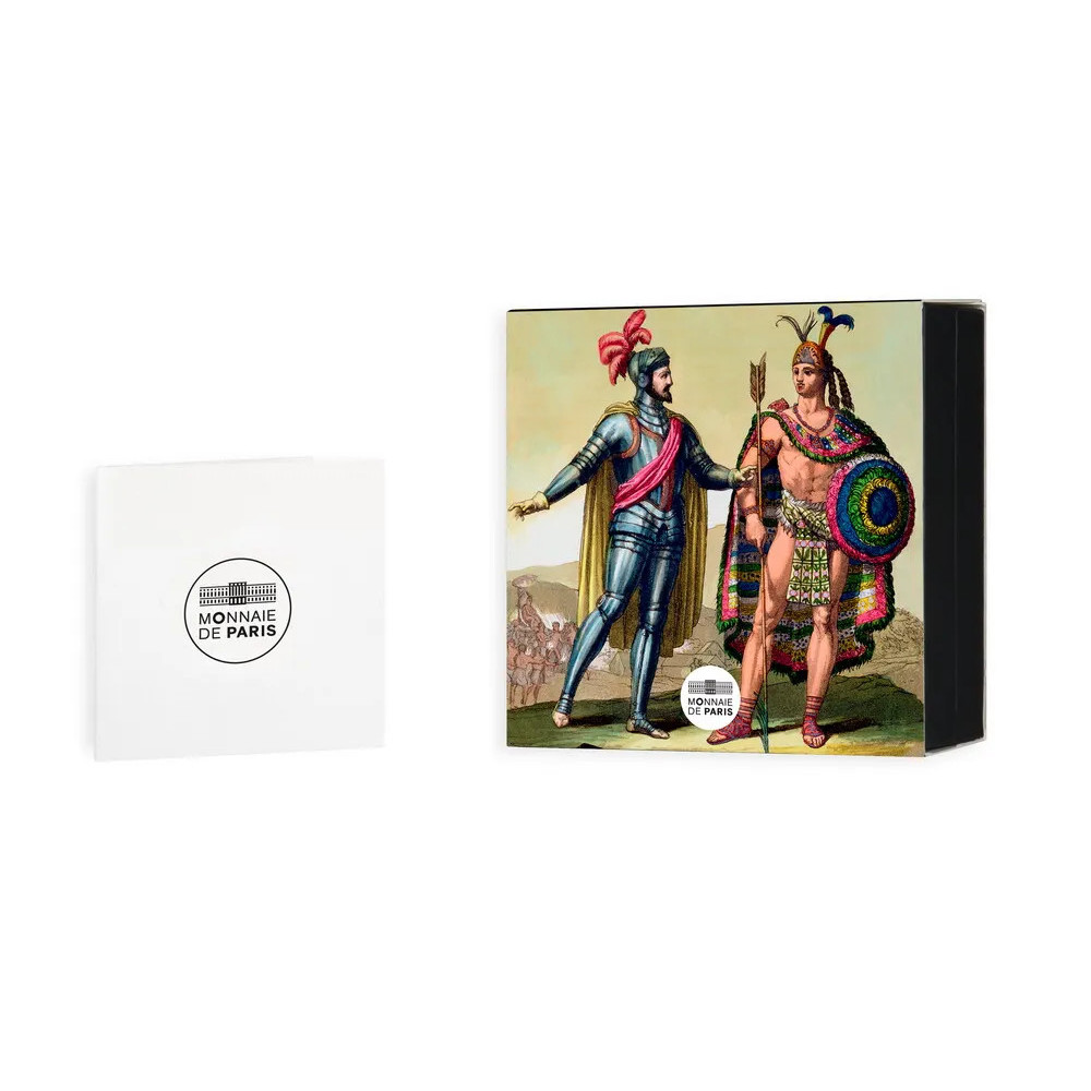 Die Vorderseite dieser Münze zeigt eine Originalkomposition des Graveurs Joaquín Jiménez. Zwei einander gegenüberliegende Porträts stellen den spanischen Eroberer und Atahualpa, den letzten Inka-Kaiser, dar. In der Mitte befindet sich ein vergoldetes Inka-Götzenbild "EL DORADO" über einem mythischen See, wo der mit Goldstaub bedeckte Inka-Herrscher dem See erhebliche Reichtümer geopfert haben soll, um die Gottheit im Wasser zu besänftigen.