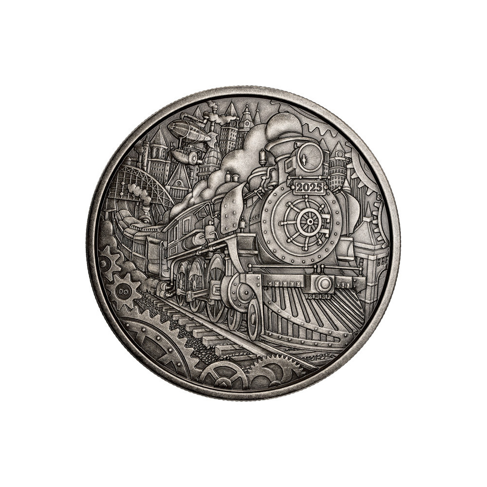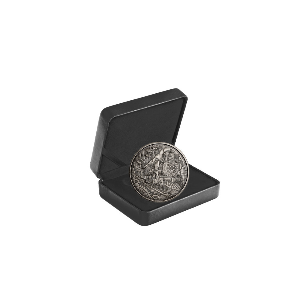 Die Münze besteht aus 3 Unzen 99,99 % reinem Silber und ist Teil einer weltweit auf 2 500 Stück limitierten Auflage. Der gezackte Rand unterstreicht den industriellen Look, und die antike Oberfläche verleiht der Münze eine dezente Patina, die das Aussehen von altem Metall und Maschinen unterstreicht. Auf der Vorder- und Rückseite sind zahlreiche Details wie Zahnräder eingraviert, die ein attraktives Steampunk-Motiv darstellen.