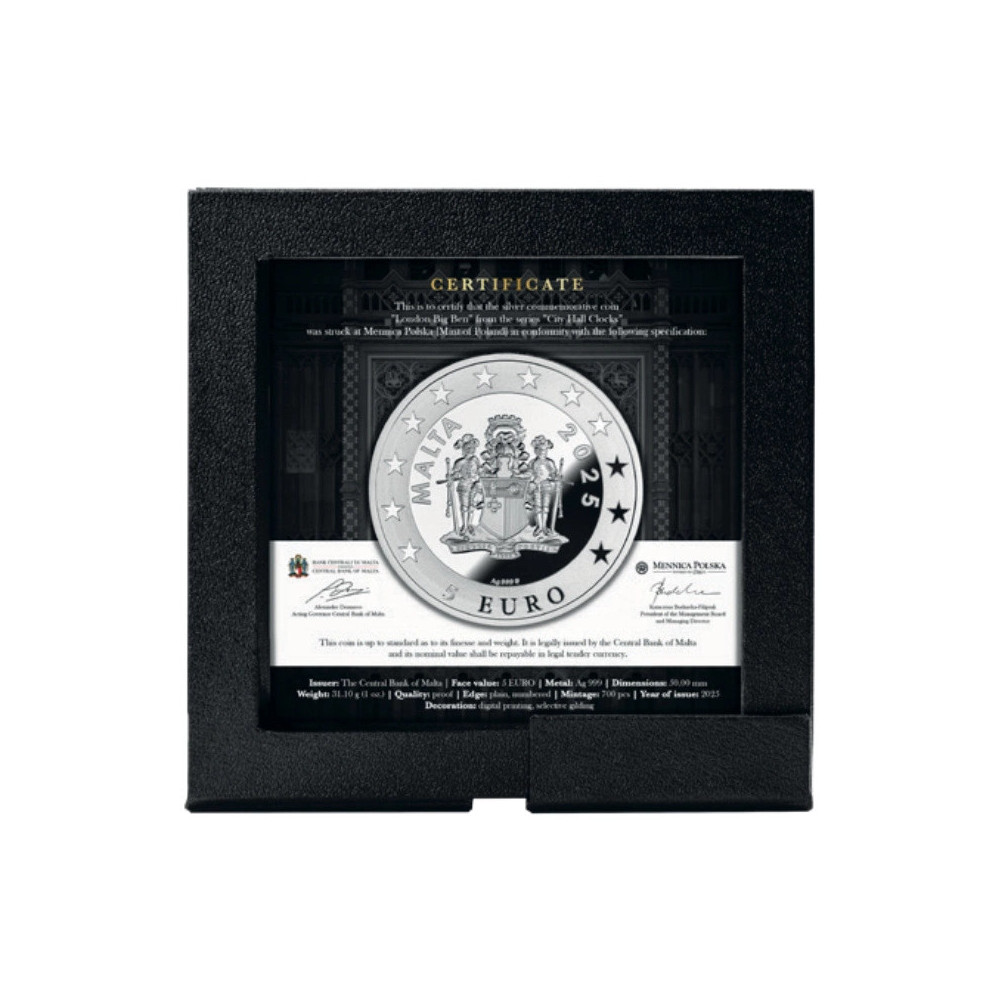 Diese exklusive 1 oz Silbermünze ist die zweite Ausgabe der Serie "City Hall Clocks" und tickt im Rhythmus von London. Big Ben. Erhaben. Unerschütterlich. Er schneidet durch die neblige Luft über der Themse. Jede Viertelstunde läutet "Westminster Quarters". Erhobene Augen, während die Schritte auf dem Kopfsteinpflaster widerhallen. Atmen die kühle Luft ein. Die Herzen werden von der Schallwelle gefangen genommen. Immer noch von Hand gedehnt. Ein unerbittlicher Überlebender der Wut des Zweiten Weltkriegs. Ein Beweis für das Durchhaltevermögen, gegossen in Proof-Perfektion. Die Münze ist in einem Etui mit einem Echtheitszertifikat versiegelt. Nur 700 Stück auf der Welt.