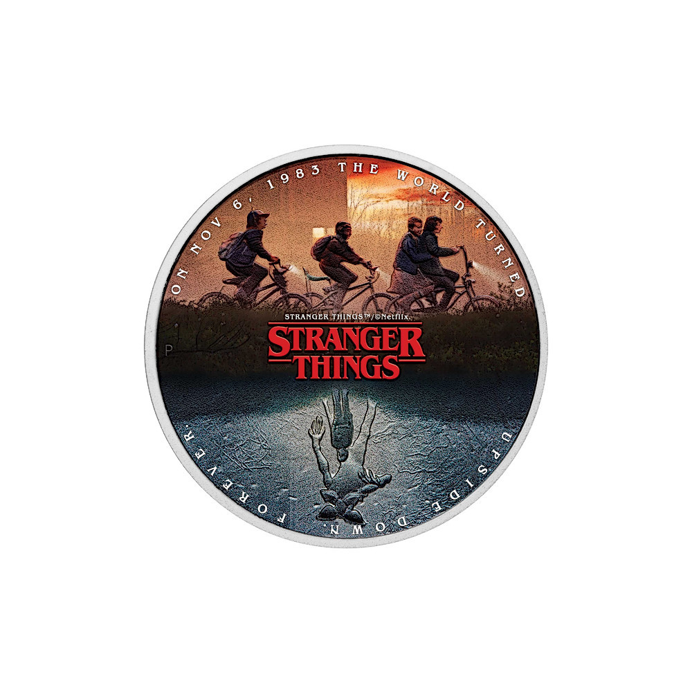 Die bunte Rückseite der Münze zeigt die geheimnisvolle Welt von Hawkins. Die obere Hälfte der Münze zeigt Mike, Dustin, Lucas und Eleven auf einer abenteuerlichen Fahrradtour, während die untere Hälfte das unheimliche Upside Down mit Will und der bedrohlichen Präsenz eines Demogorgons zeigt. Das Design enthält die Inschrift "ON NOV 6, 1983 THE WORLD TURNED UPSIDE DOWN. FOREVER." sowie das "STRANGER THINGS"-Logo und das "P"-Prägezeichen der Perth Mint.