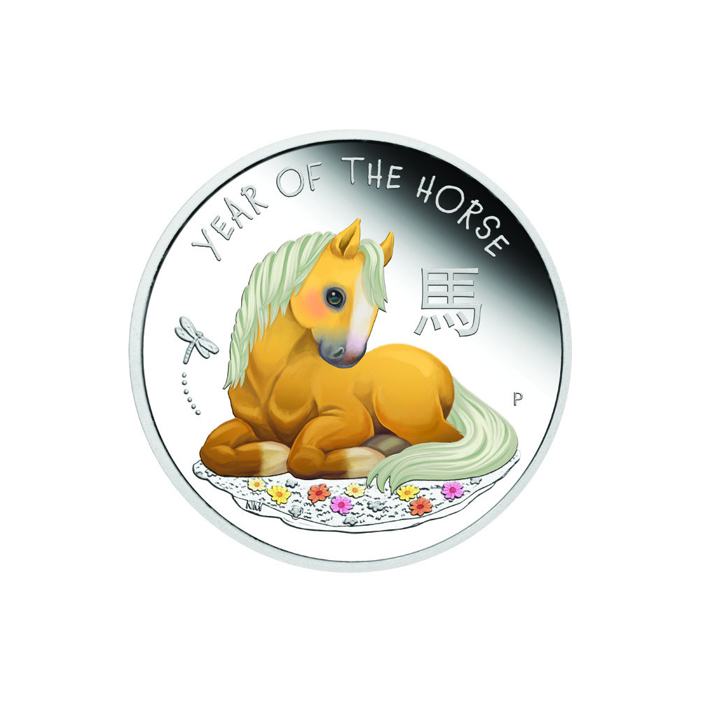 Die Rückseite der Münze zeigt ein farbenfrohes Motiv eines glücklichen Fohlens, das auf einem mit zarten Blumen geschmückten Rasen ruht, über dem eine Libelle fliegt. Das Motiv enthält außerdem das chinesische Schriftzeichen für "Pferd", die Aufschrift "YEAR OF THE HORSE" und das Prägezeichen "P" der Perth Mint.