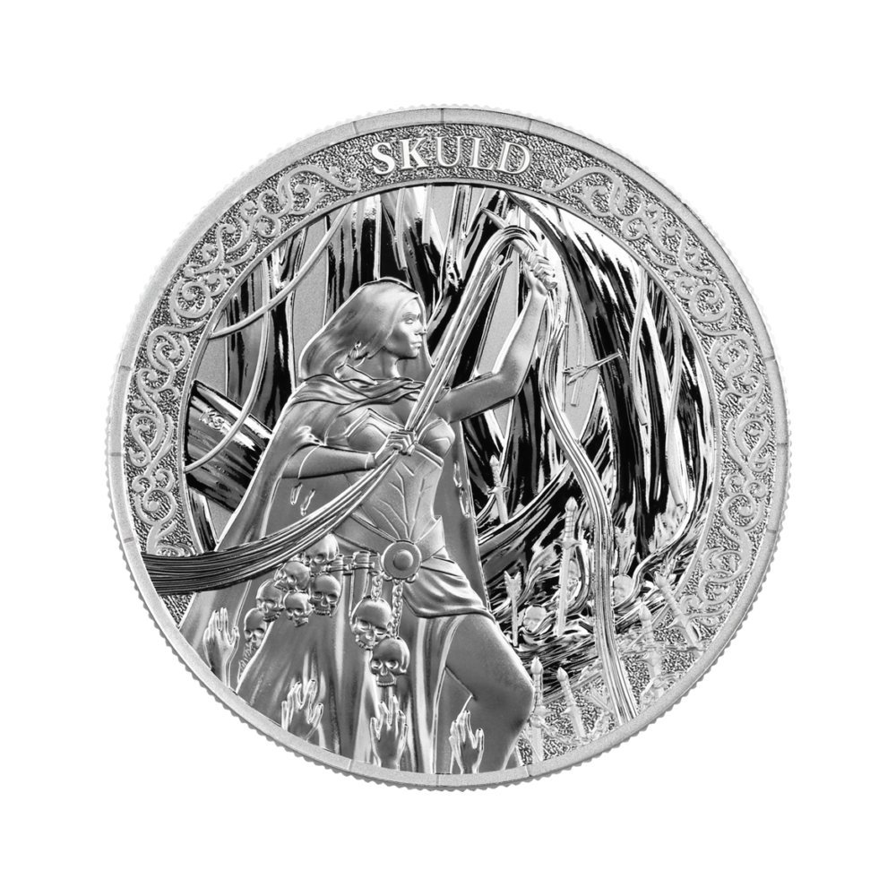 In der Interpretation der Germaniam Mint wird Skuld als geheimnisvolle Gestalt dargestellt, die einen Kapuzenmantel trägt, der das Unbekannte verbirgt. An seinem Gürtel hängen menschliche Schädel, Symbole der Sterblichkeit und der Preis für das Wissen um die Zukunft. In ihrer Hand hält sie ein scharfes Messer, mit dem sie den Lebensfaden durchschneidet und das Schicksal derer bestimmt, die ihre Visionen suchen. Sie steht am Fuße von Yggdrasil, umgeben von den Gefallenen, den noch Lebenden und zahlreichen Schwertern, die von den noch bevorstehenden Schlachten zeugen.