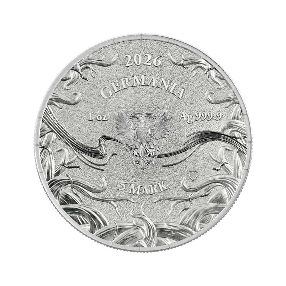 Der Doppeladler der Münze Germania ist umgeben von den Wurzeln der Yggdrasil und den goldenen Fäden des Schicksals. Die zerrissenen Fäden symbolisieren, dass die Zukunft zwar vorherbestimmt ist, aber dennoch von den Entscheidungen und Handlungen der Lebewesen abhängt und somit die Möglichkeit besteht, das Schicksal zu ändern.