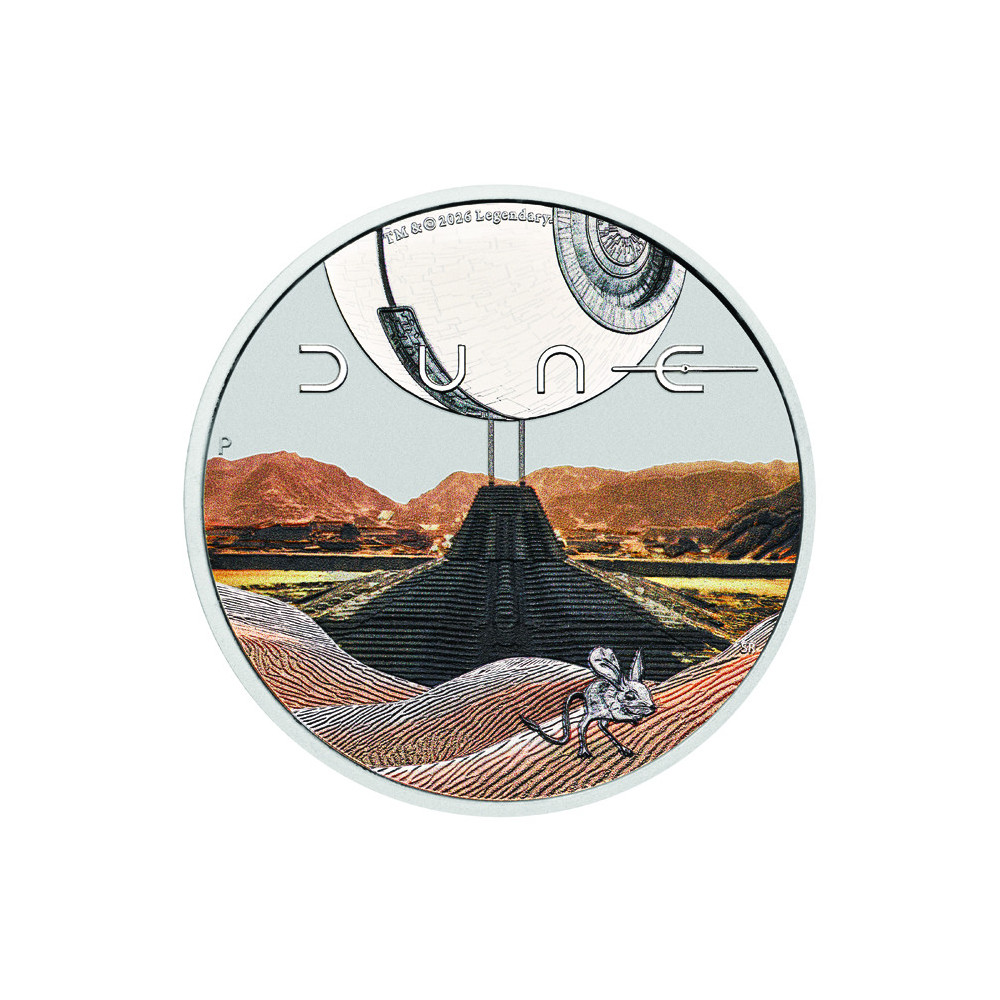 gestaltet von Sean Rogers, zeigt eine farbenfrohe Szene vom Planeten Arrakis. Im Hintergrund sind das monumentale Schiff des Imperators und das kaiserliche Zelt vor dem Hintergrund der weiten Wüste zu sehen. Im Vordergrund ist die Wüstenmaus Muad'Dib zu sehen, ein Symbol für die Anpassungsfähigkeit und geistige Stärke des Volkes der Fremen. Die Komposition umfasst auch das Dune-Logo und das Münzzeichen "P".