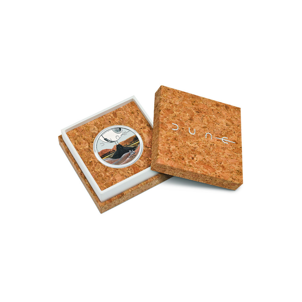 Die Münze wird aus 99,99 % reinem Silber geprägt, wiegt 1 Unze (31,107 g) und hat einen Durchmesser von 40,90 mm. Die Ausgabe 2026 hat einen Nennwert von 1 TVD und ist auf eine maximale Auflage von 3 000 Stück begrenzt. Die Münze wird mit einem nummerierten Echtheitszertifikat geliefert und ist in einem FSC-zertifizierten Korketui mit dem Dune-Logo und einer thematischen Umverpackung untergebracht. Dies ist ein Angebot für Sammler und Fans dieses Universums.