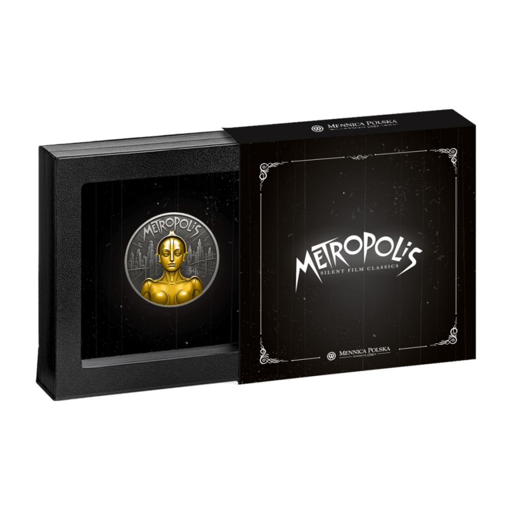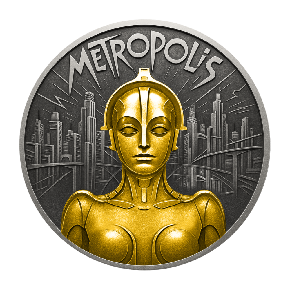 Eine ikonische Münze, inspiriert von Fritz Langs Meisterwerk. Die ikonische Figur der Maria und die geometrische Stadt der Zukunft sind auf einer 1-Unzen-Münze aus 999er Feinsilber mit Antik-Finish und Teilvergoldung in einer streng limitierten Auflage von 500 Stück abgebildet.