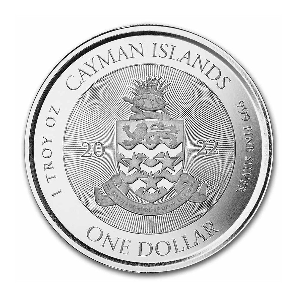 Die Vorderseite zeigt das Wappen der Kaimaninseln sowie das Metallgewicht, den Feingehalt und den Nennwert.