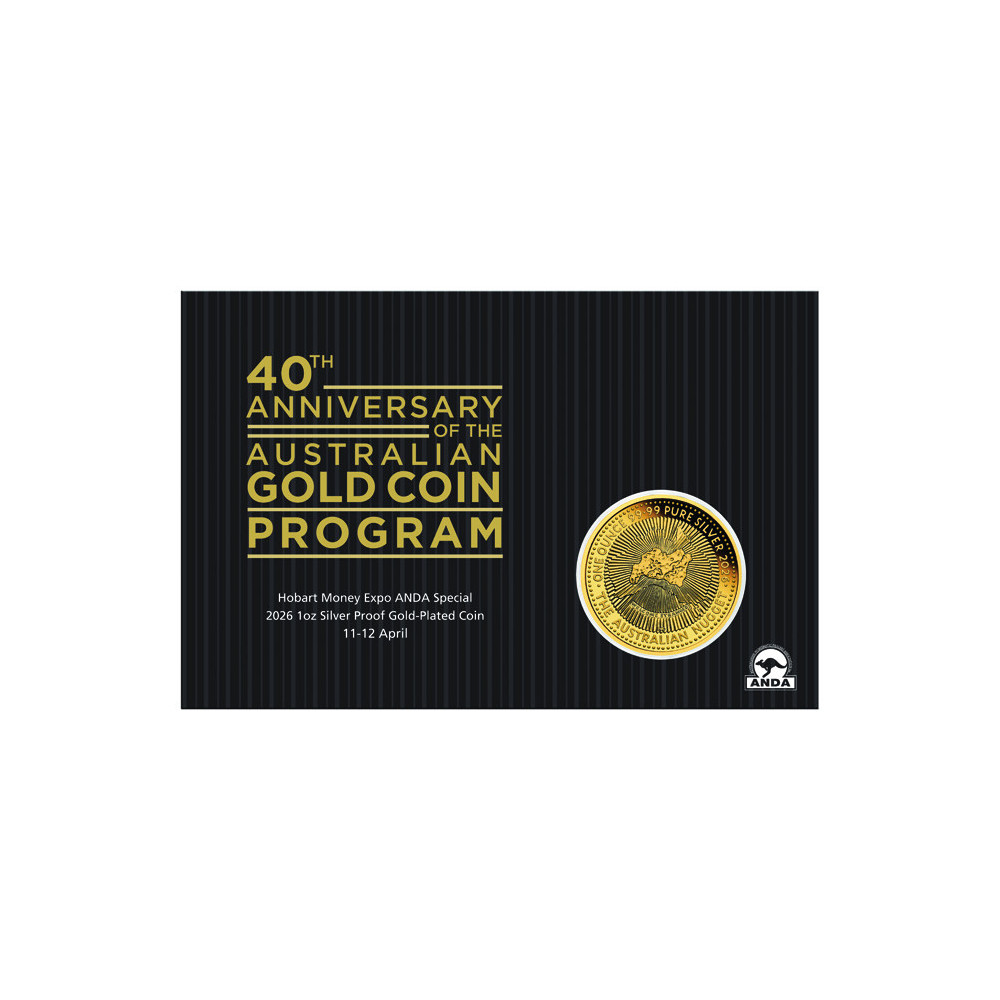 Die Münze befindet sich in einer schwarz gestreiften Präsentationskarte mit der Aufschrift "Hobart Money Expo ANDA Special 2026 1oz Silver Proof Gold-Plated Coin 11-12 April" und dem Logo der Australasian Numismatic Dealer's Association und war nur auf der Messe in Hobart zu erwerben.