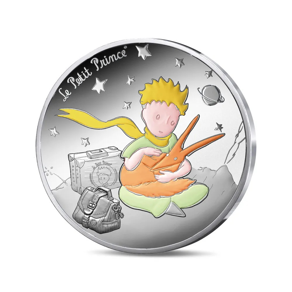 Auf der Vorderseite der Münze sitzt der Kleine Prinz im Schneidersitz in der Mitte auf der Oberfläche seines Planeten. Er blickt liebevoll auf den Fuchs, den er in seinen Armen hält. Links von der Figur stehen zwei Koffer, die darauf warten, dass ihr Besitzer seine Reise antritt. Hinter dem Kleinen Prinzen leuchtet der Himmel voller Sterne, unter denen der Saturn zu sehen ist. Am Rande der Münze ist das Logo des Kleinen Prinzen in den Himmel eingraviert.