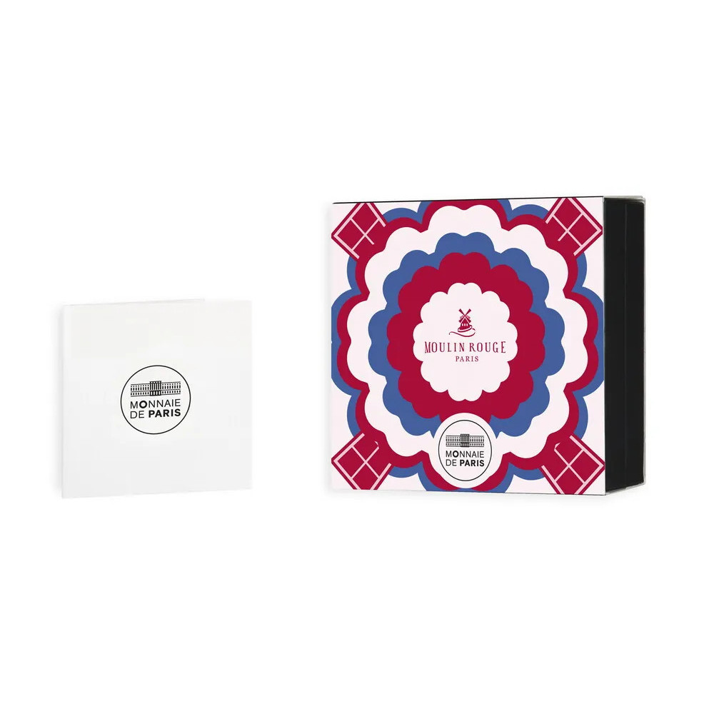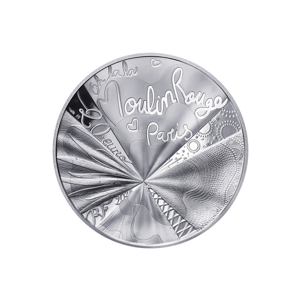 Die Rückseite der Münze ist um die ikonischen Flügel des Moulin Rouge herum aufgebaut. Jeder Teil der Münze verweist auf ein Kunsthandwerk: Kostümdesign, Federschmuck, Stickerei, Schuhmacherei und Ballett. Diese sind mit Elementen der festlichen und spektakulären Welt des Moulin Rouge verwoben. Das Ganze ist eine Hommage an die Handwerkskunst, die den Zauber des Kabaretts ausmacht. Die Unterseite der Münze trägt die Bezeichnung RF" und das Jahr der Prägung. Auf der Oberseite der Münze sind das Münzzeichen der Pariser Münze, Joaquin Jimenez und die Werkstatt des Graveurs sowie der Nennwert eingeprägt.