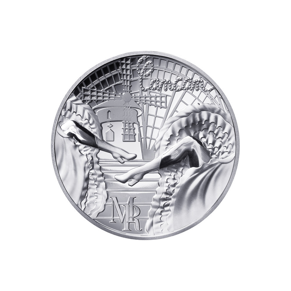 Die Vorderseite der Münze zeigt zwei französische Cancan-Tänzerinnen im Vordergrund, die in dynamischer Bewegung eingefangen sind. Im Hintergrund ist das legendäre Moulin Rouge mit seinen charakteristischen Flügeln zu sehen, vor dem Hintergrund eines französischen Cancan-Gemäldes, das einen Teil des Eiffelturms zeigt. Die Initialen Moulin Rouge vervollständigen das Motiv.